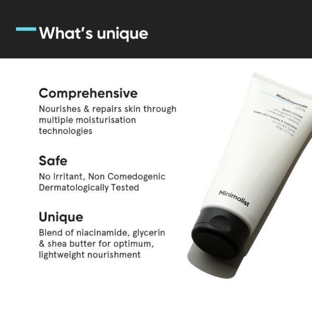 Minimalist 5% Niacinamide Body Lotion is an everyday body lotion for all skin types. It is infused with antioxidant niacinamide (vitamin B), shea butter, glycerine and betaine which helps in hydrating and nourishing the skin and reduces sun damage.