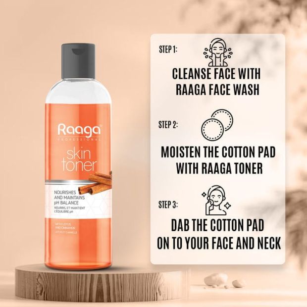 Raaga Professional Skin Toner with lotus extracts and cinnamon is perfect for clear and healthy skin. It nourishes the skin and maintains natural pH balance. Lotus extracts helps to control sebum production and balances oily skin, it also keeps skin hydrated and improves elasticity. The antibacterial, antifungal and antioxidant properties of cinnamon helps in keeping skin clean and keeps acne and blemishes at bay. Together these ingredients reduce inflammation and promote skin healing while keeping the skin clean, soft and healthy. With regular use it visibly reduces pores and gives a clean, even looking skin tone.