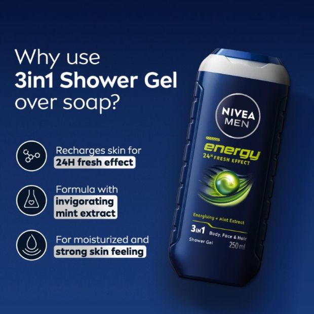 NIVEA MEN Body Wash, Energy with Mint Extracts, Shower Gel for Body, Face & Hair(250ml).
